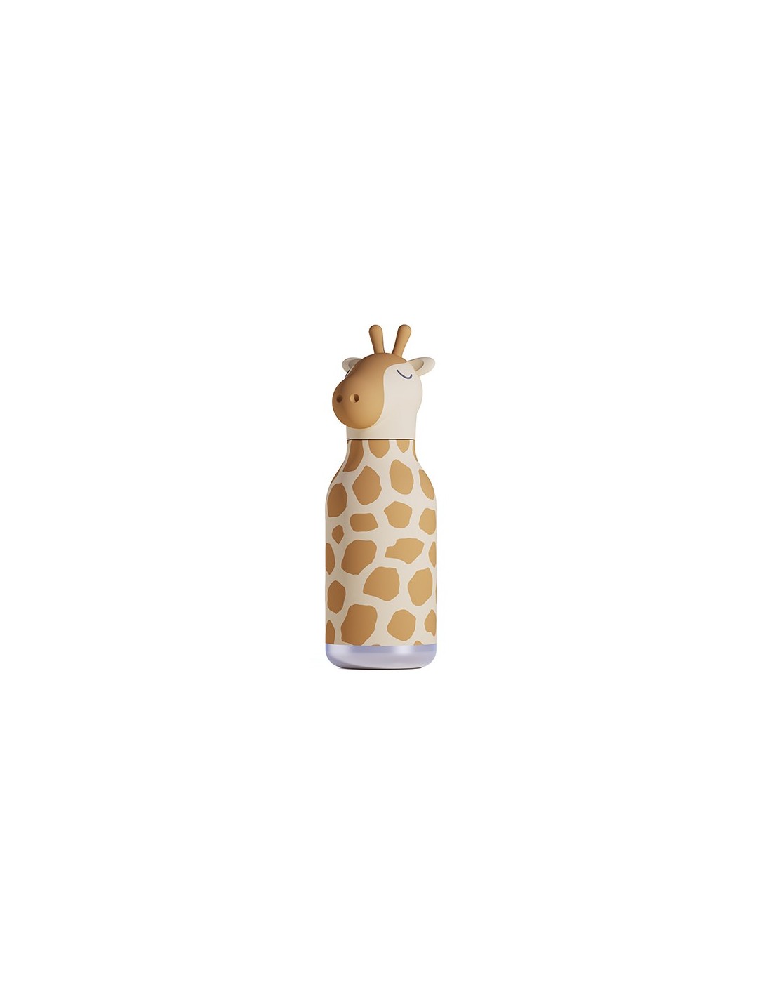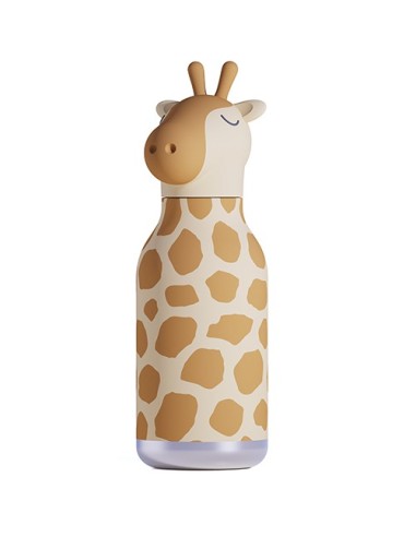 Botella infantil con tapa en forma de jirafa y pajita de silicona. Mantiene las bebidas frías hasta 24 horas. Incluye cepillo limpiador escondido en el tapón.