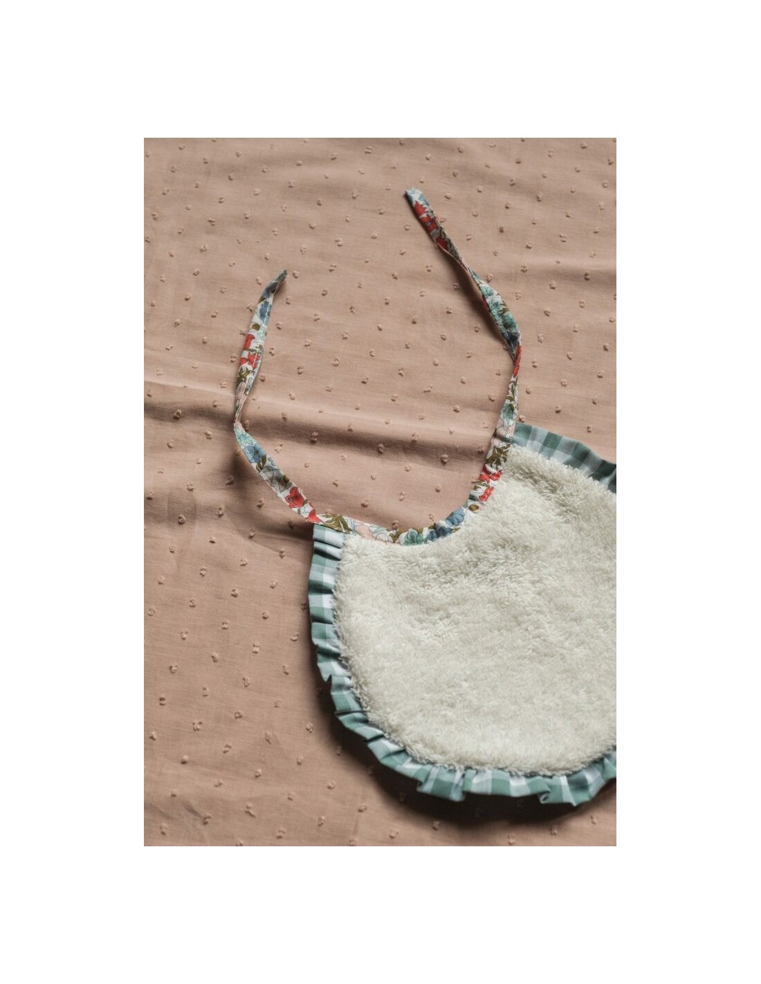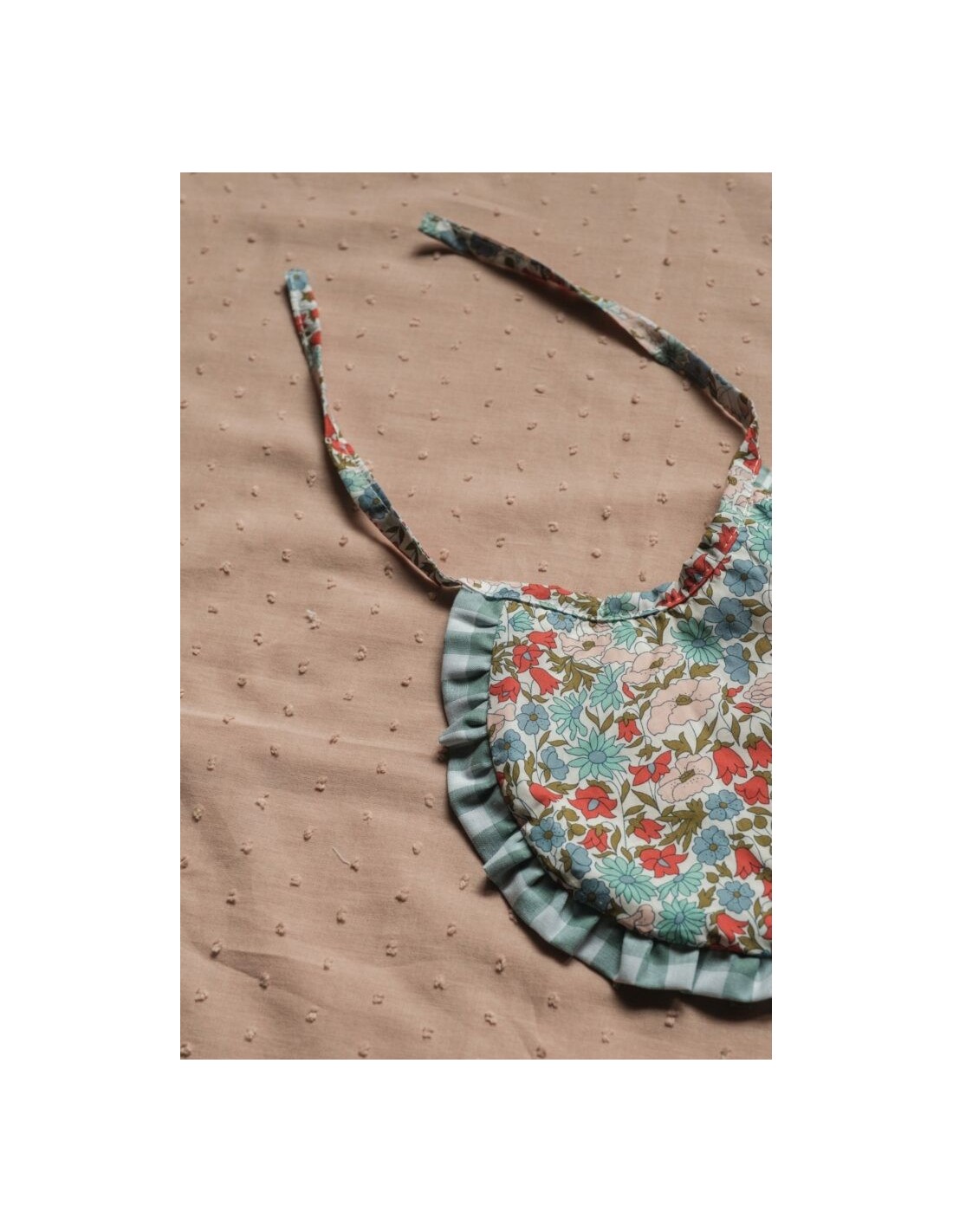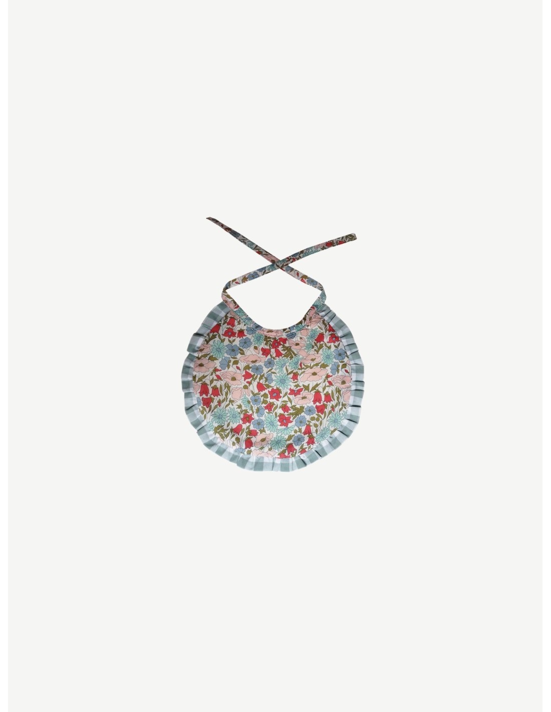 Babero de recién nacido con rizo de Algodón. Se atan al cuello mediante lazo. Talla hasta los 6 meses aprox. Confeccionado con tejido Liberty London Original.