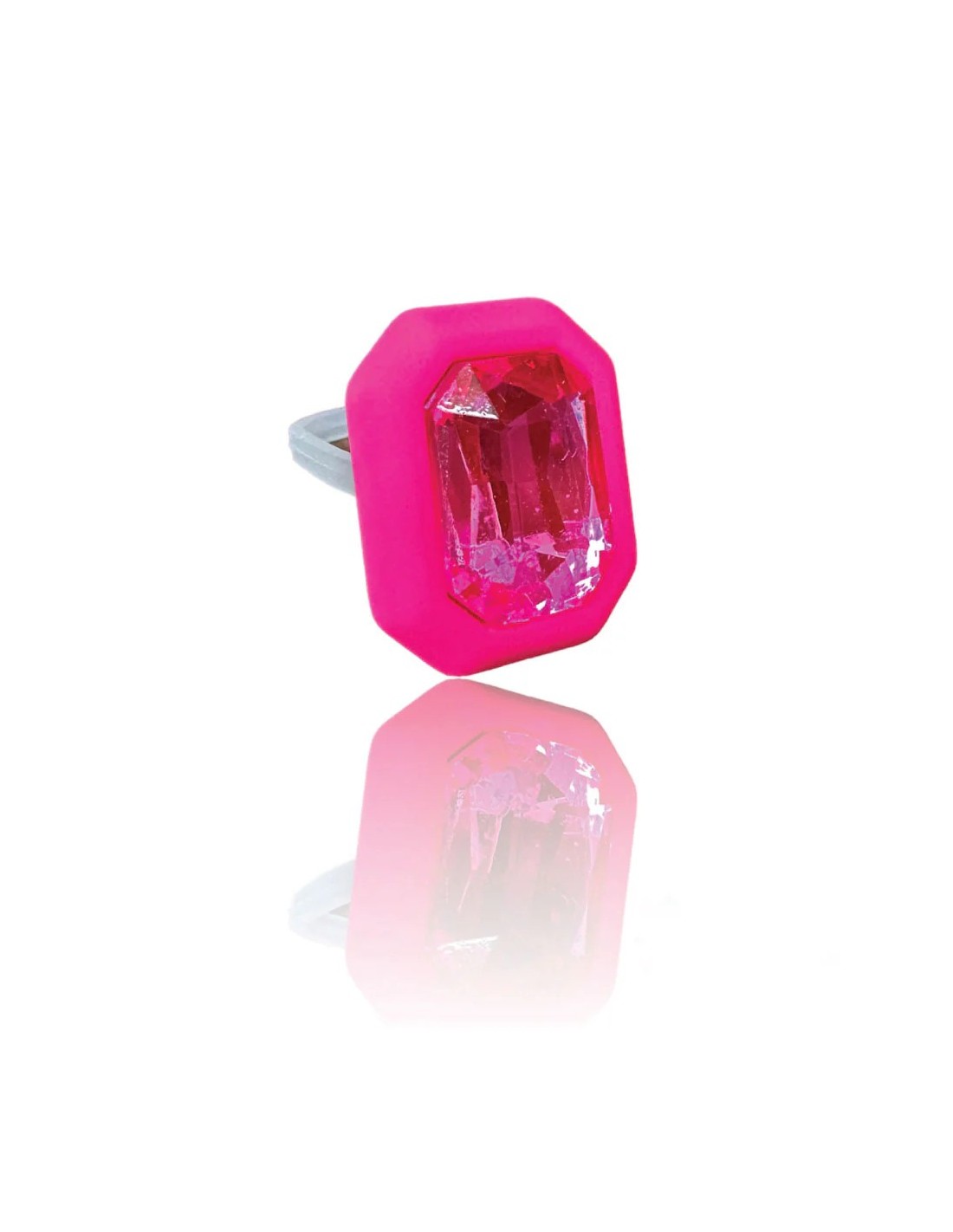 Hecho de resina con un diamante de imitación rosa intenso y engastado en nuestra base de anillo de silicona ecológica, se adhiere fácil y divertidamente a cordones, correas, tiras de velcro y chanclas.