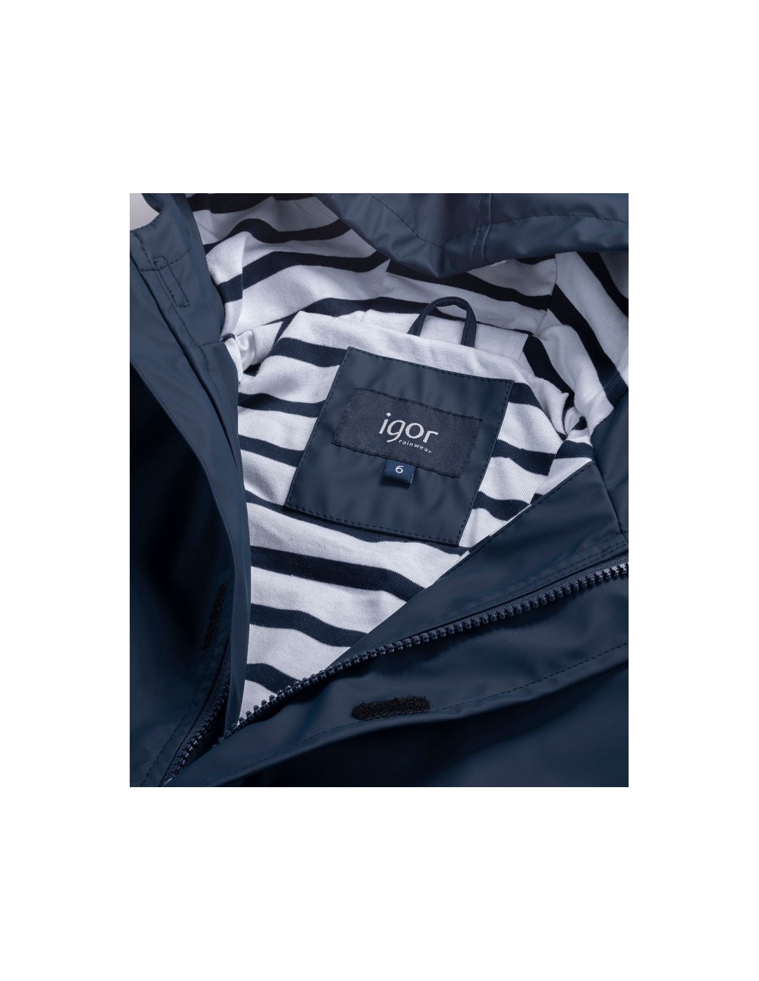 Chubasquero clásico impermeable con bolsillos frontales, solapa y forro interior de algodón a rayas.