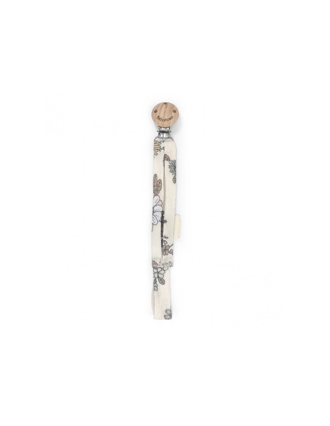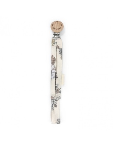 Práctica y funcional, esta pinza de madera incluye una cinta de tejido suave y resistente diseñada para sujetar el chupete y fijarlo cómodamente al bebé.
