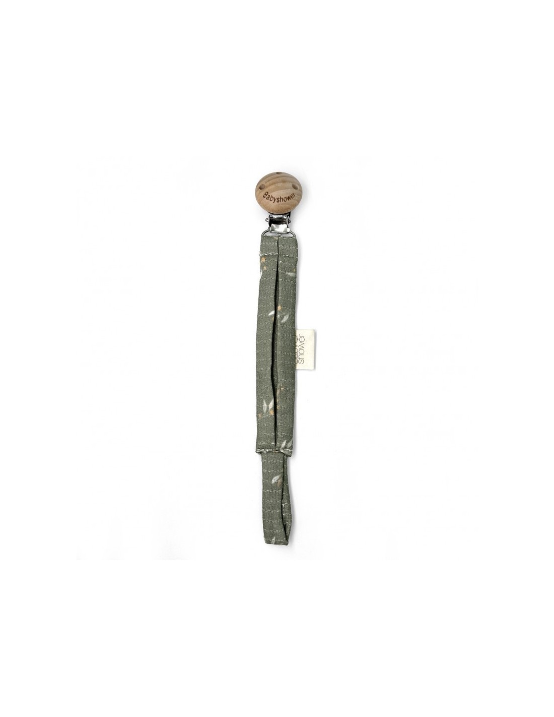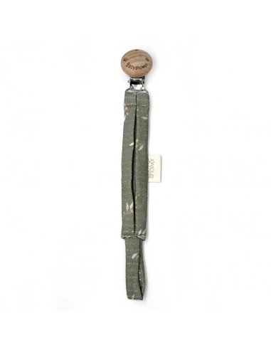 Práctica y funcional, esta pinza de madera incluye una cinta de tejido suave y resistente diseñada para sujetar el chupete y fijarlo cómodamente al bebé.