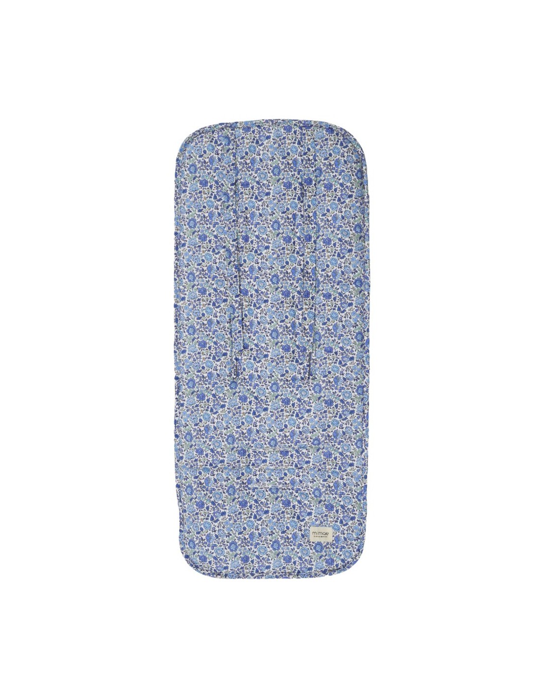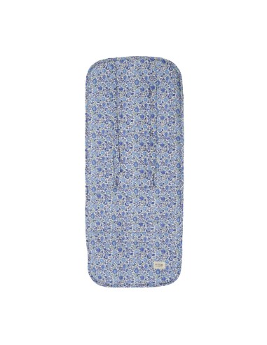 Colchonetas universales para sillas de paseo. Mulliditas tienen una guata de grosor medio y el trasero en tejido Maya 3D acolchado y transpirable. Tienen 10 ojales para que puedan adaptarse a diferentes tipos de silla. Sistema de enganche mediante goma y lazos. Estampado Liberty Azuli.