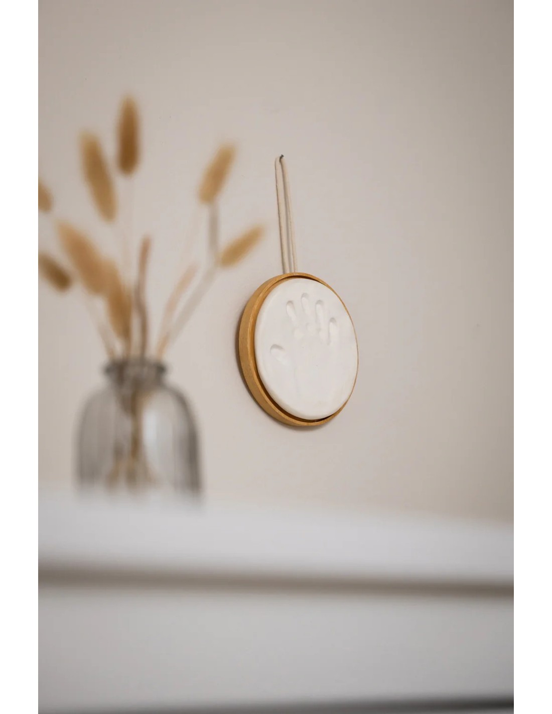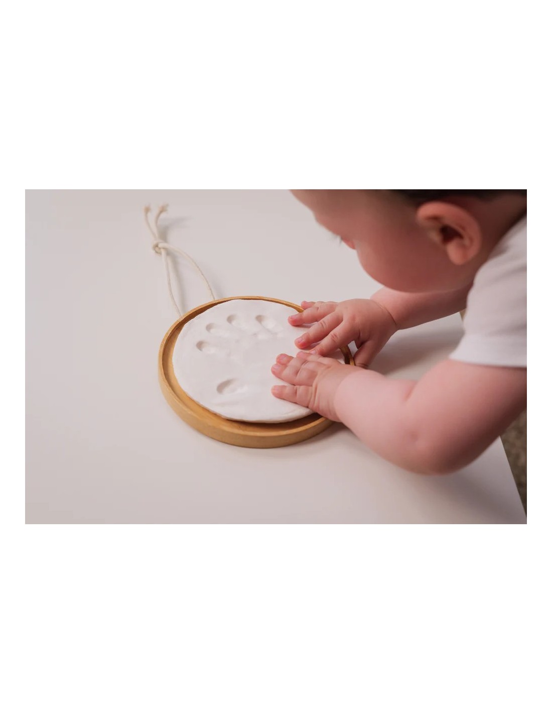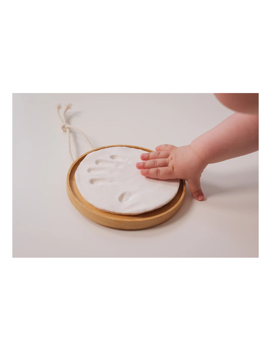 Este kit completo incluye arcilla hipoalergénica, un rodillo para la aplicación, un marco de madera redondo para decoración, un cordón para colgar e instrucciones para crear fácilmente la impresión.