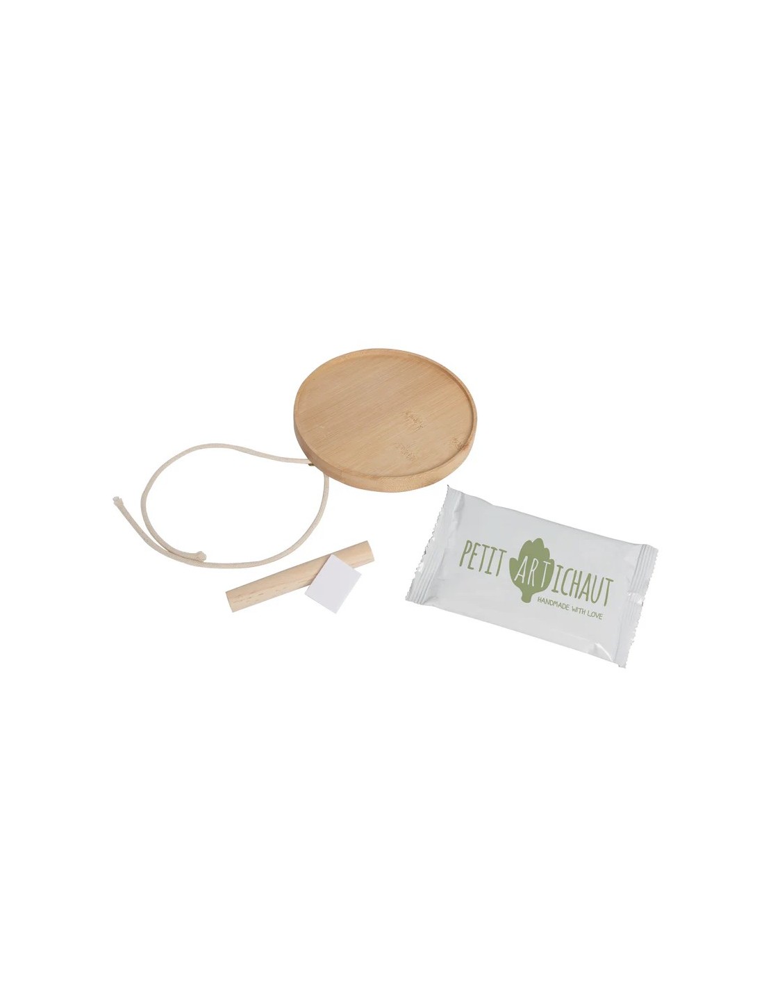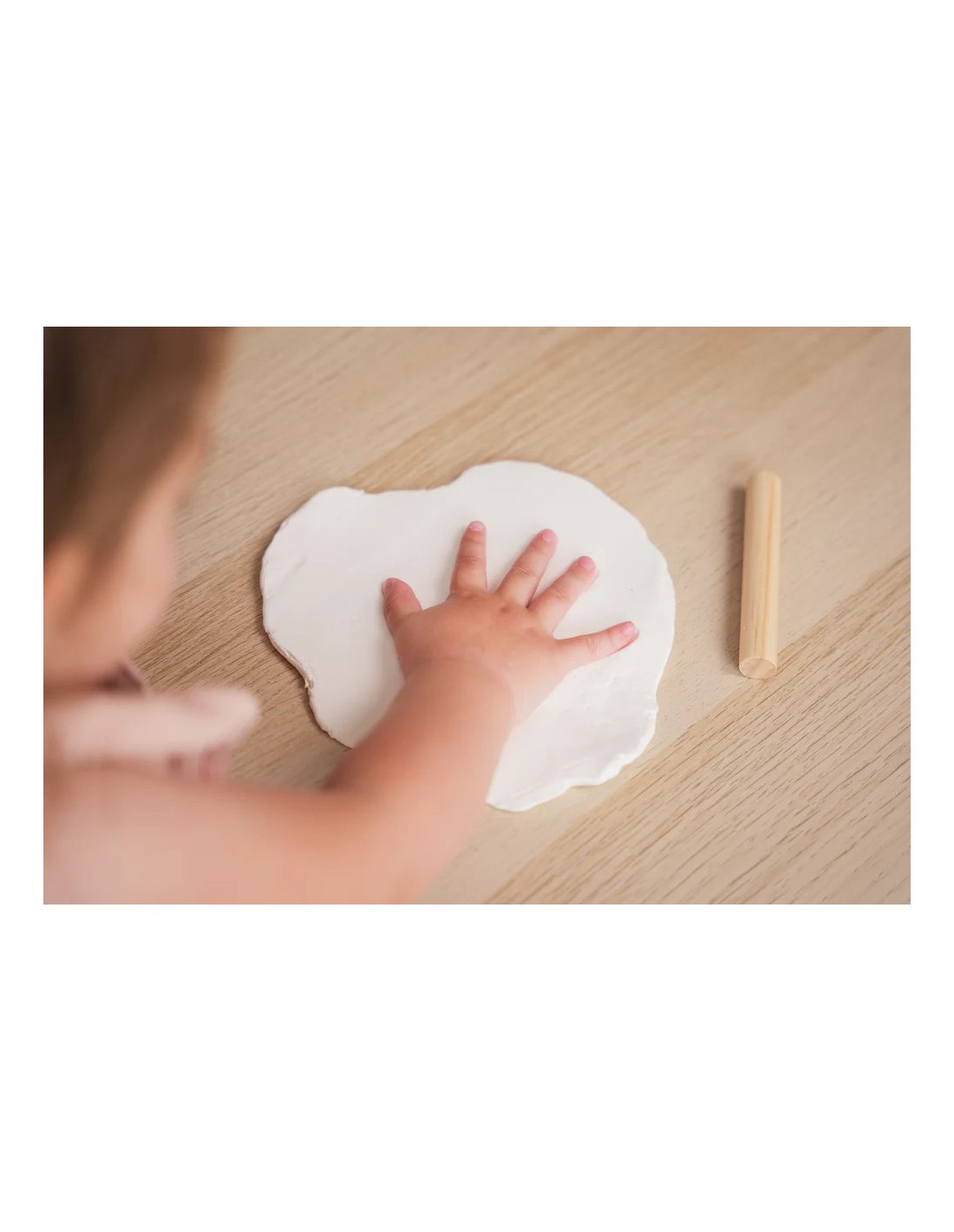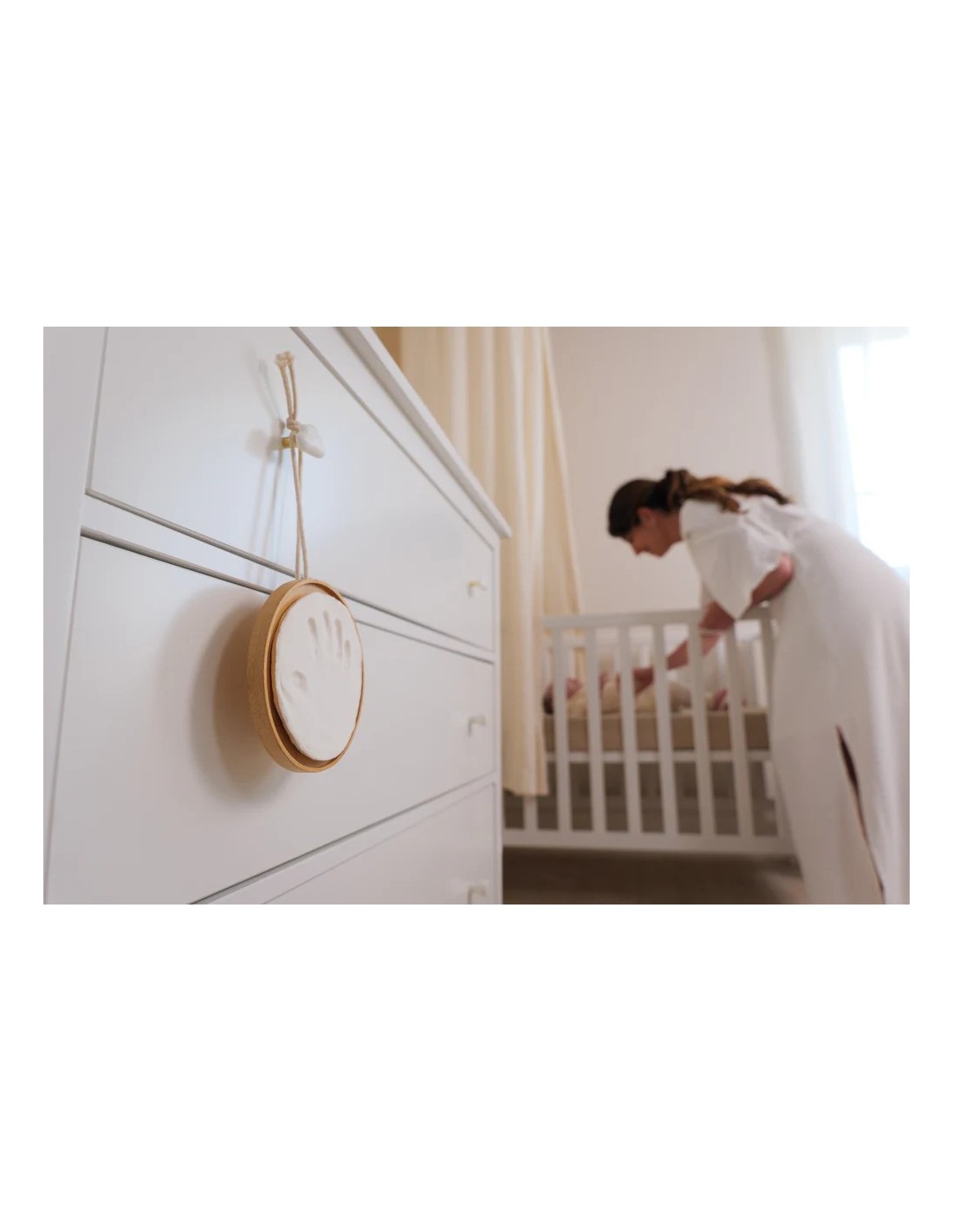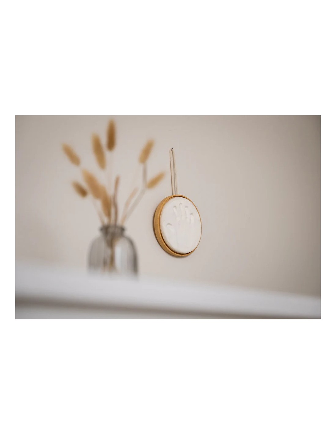 Este kit completo incluye arcilla hipoalergénica, un rodillo para la aplicación, un marco de madera redondo para decoración, un cordón para colgar e instrucciones para crear fácilmente la impresión.
