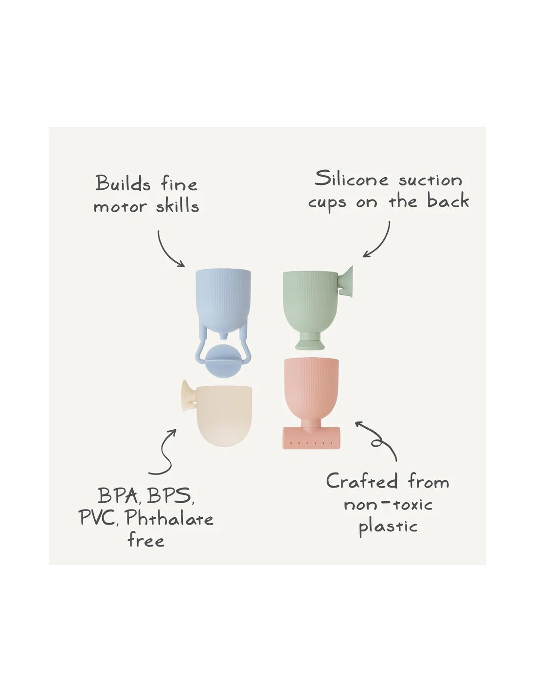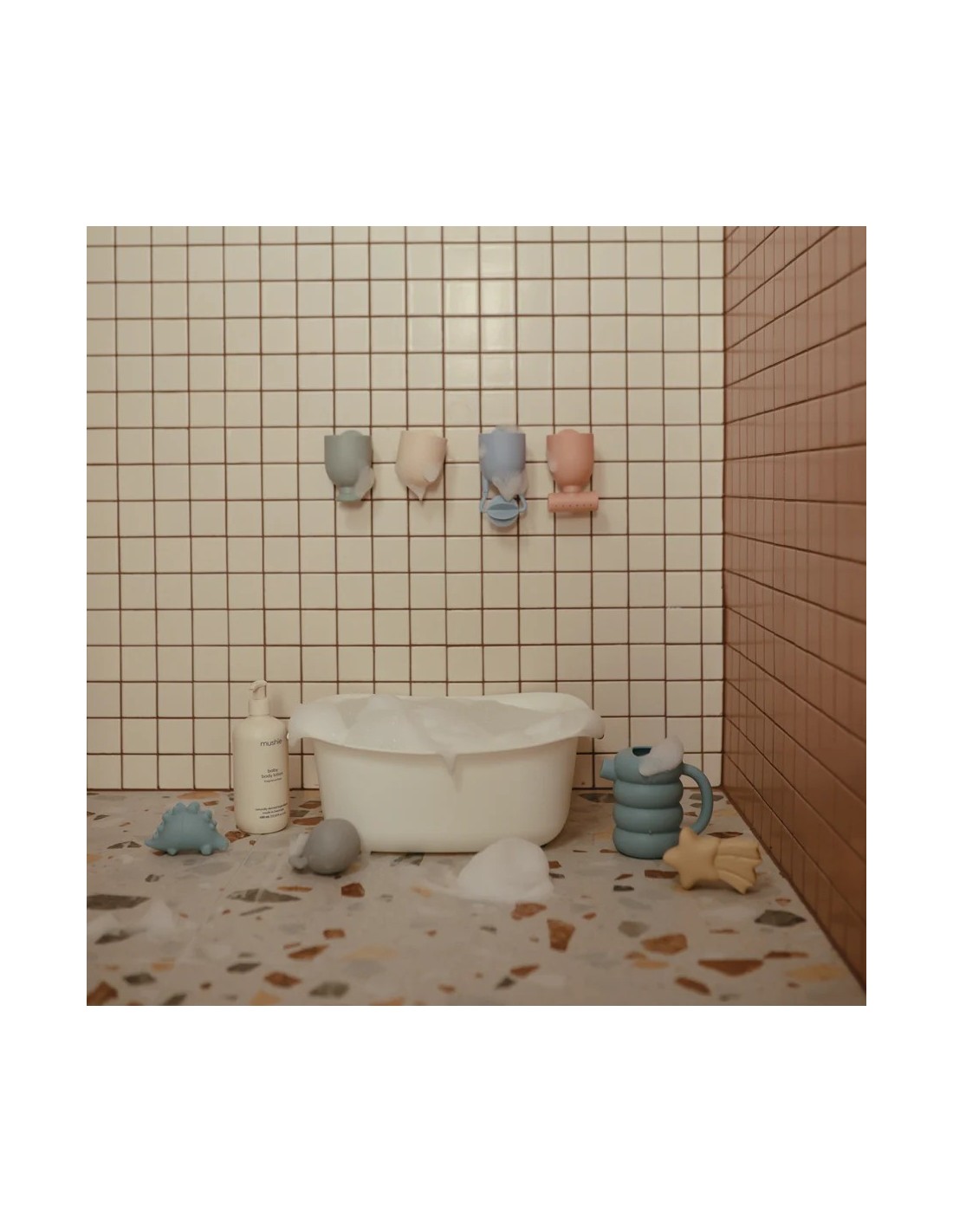 Fabricado con materiales no tóxicos y duraderos en colores suaves para una experiencia relajante a la hora del baño. Fácil de limpiar y guardar, este es un juguete imprescindible para convertir los baños comunes en momentos encantadores.