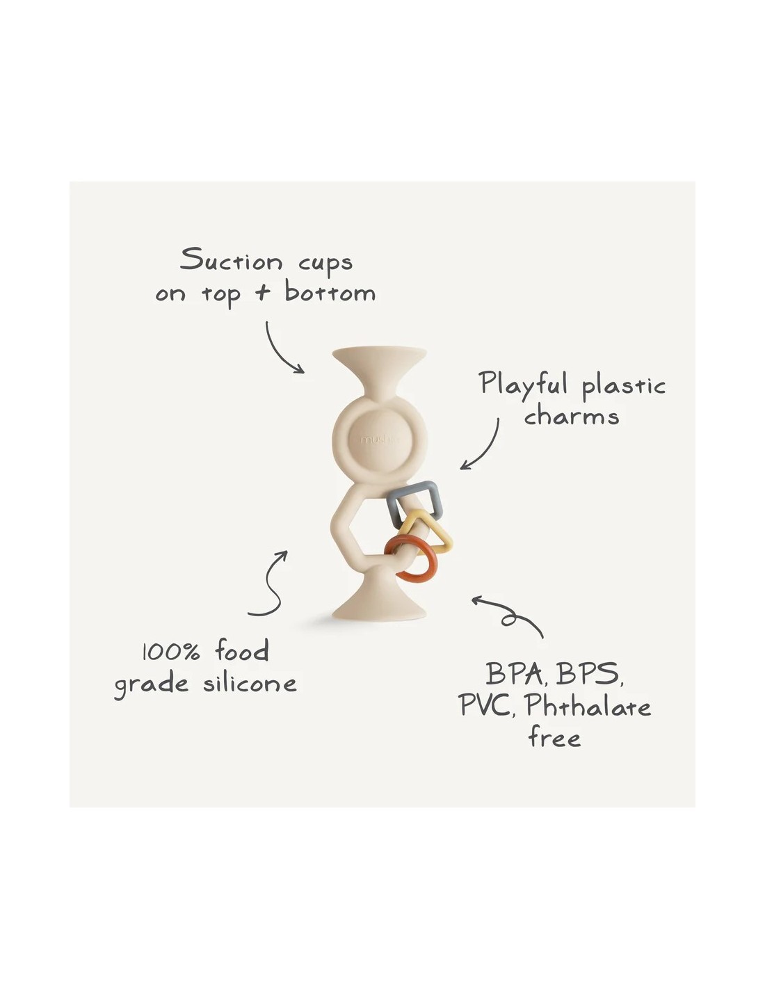 Nuestro juguete de succión HexaPop es un compañero de juego atractivo que mantiene a los pequeños ocupados en casa o en movimiento. Las ventosas resistentes en la parte superior e inferior se adhieren fácilmente a superficies lisas, manteniéndolo al alcance de su bebé. El tamaño compacto y el material fácil de limpiar lo hacen perfecto para viajar y permite a los padres succionarlo en sillas, mesas, bandejas de avión o en cualquier lugar donde su bebé necesite un poco de entretenimiento adicional.