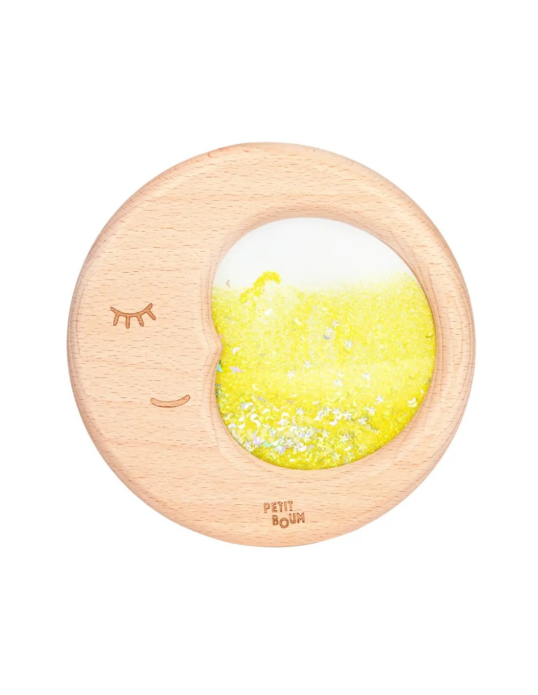 Dulces sueños. Nuestra Sensory Moon es una invitación a ensoñar y acurrucarse entre sus dulces centelleos luminosos. Fabricada en madera de haya natural, en su interior se agitan pigmentos que capturan la atención de los más pequeños, ayudándoles a ejercitar el seguimiento ocular y a entrar en un estado de calma. Nuestra Sensory Moon brilla en la oscuridad: basta con cargarla antes en una fuente de luz natural o de luz negra.