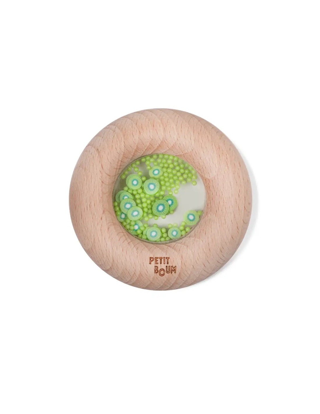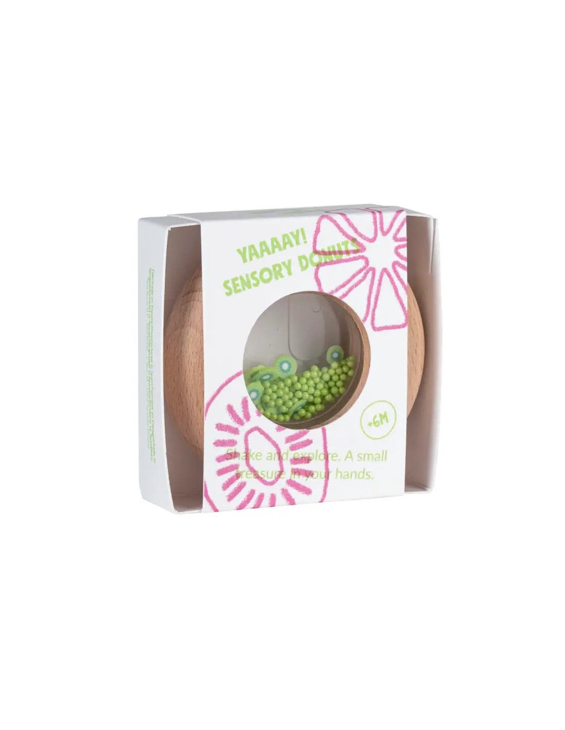Nuestro nuevo juguete sensorial encantará a los pequeños más golosos. Es un sonajero de madera con forma de donut, ideal para que sus manos lo manipulen con comodidad. En su interior, podréis identificar figuras de frutas y verduras, que al agitarse desatan el irresistible sonido marca de la casa. Aunque apetece comérselo, está hecho de madera de haya natural, libre de tóxicos y a prueba de mordiscos.