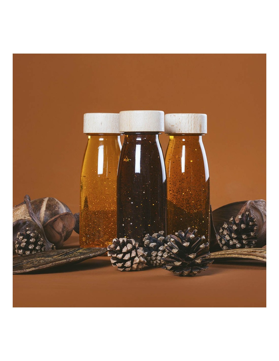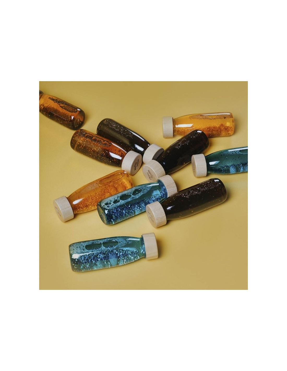 Luz, color y magia. El arcoíris al alcance de su mano. Con estas botellas, inspiradas en la gama cromática de la naturaleza, los niños descubren los colores, se maravillan con la luz, estimulan su concentración y encuentran su momento de calma.
