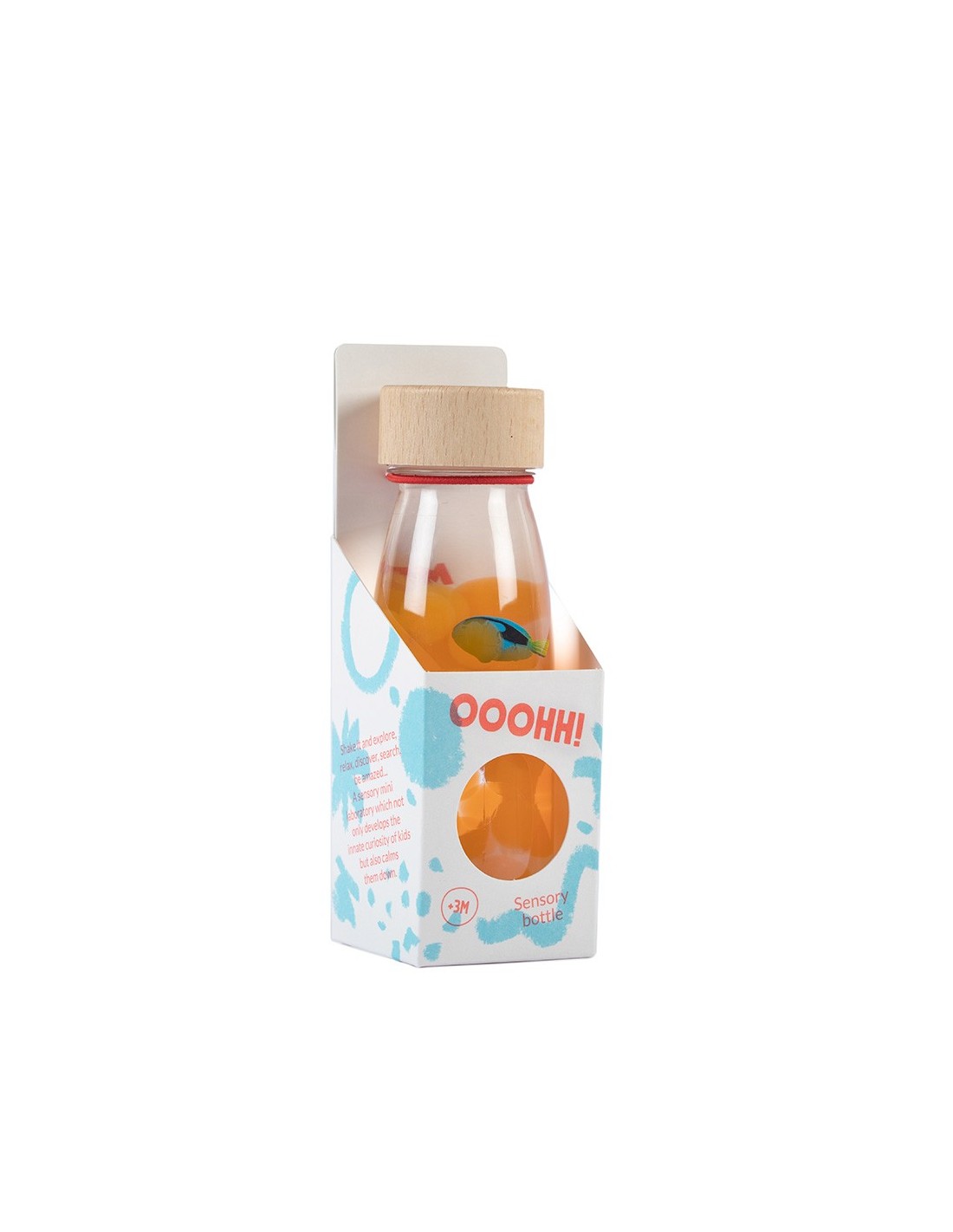 ¿Conoces la sensación de caminar por el lecho del mar? Puedes ver cómo la arena se levanta a través de las aguas turquesas y la relajación te inunda… Hemos querido recrear esa sensación para los más pequeños con esta nueva botella, con un sonido y un efecto tan hipnótico que no podrán dejar de jugar con ella. Conchas, arena, bolas de hidrogel y un curioso pez azul les esperan en los arrecifes.