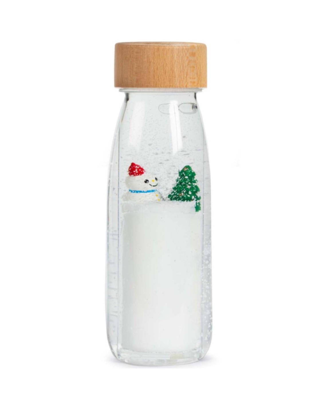 Sumérgete en un invierno mágico con la botella sensorial Move Winter de Petit Boum. Una botella brillante donde un árbol de Navidad y un muñeco de nieve se arremolinan entre purpurina plateada que imita la nieve cayendo.