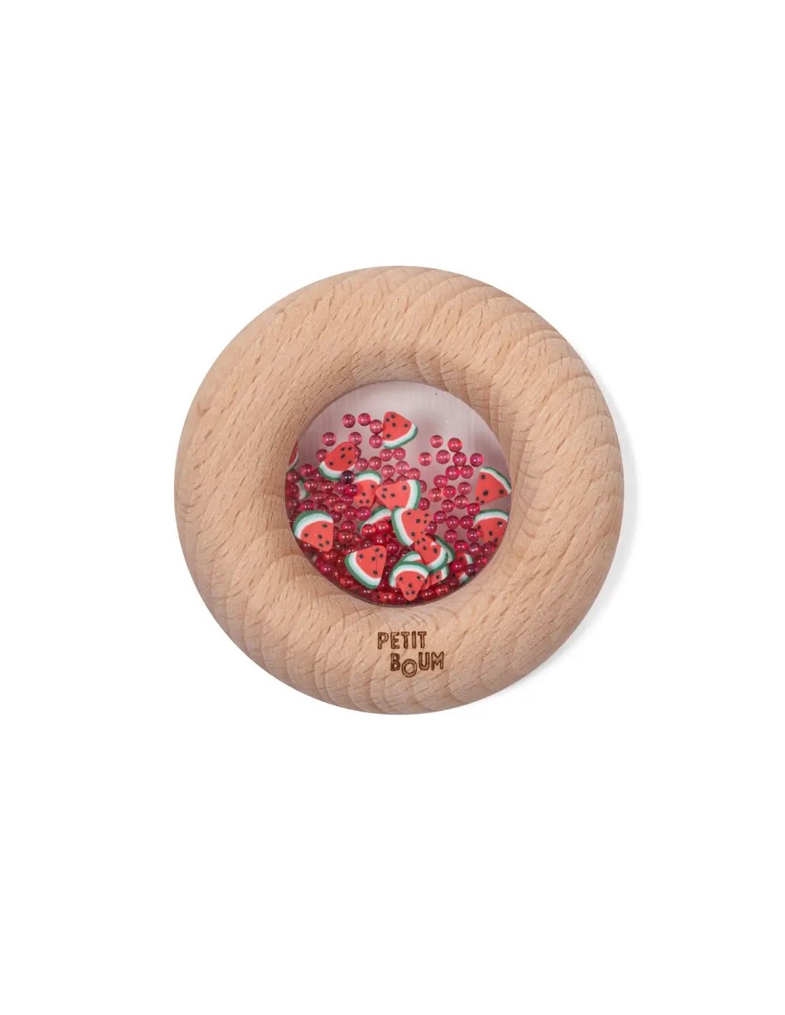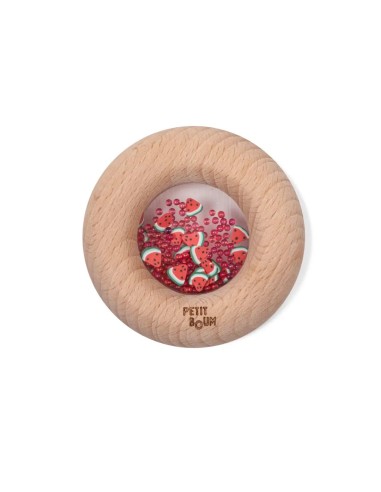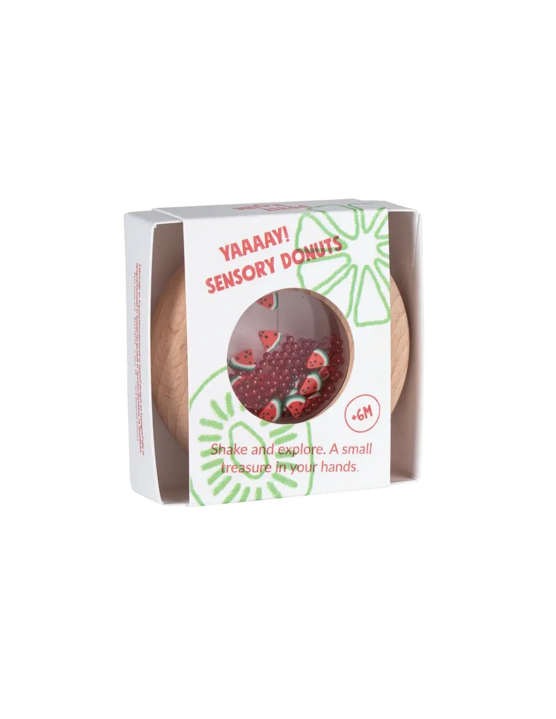 Nuestro nuevo juguete sensorial encantará a los pequeños más golosos. Es un sonajero de madera con forma de donut, ideal para que sus manos lo manipulen con comodidad. En su interior, podréis identificar figuras de frutas y verduras, que al agitarse desatan el irresistible sonido marca de la casa. Aunque apetece comérselo, está hecho de madera de haya natural, libre de tóxicos y a prueba de mordiscos.