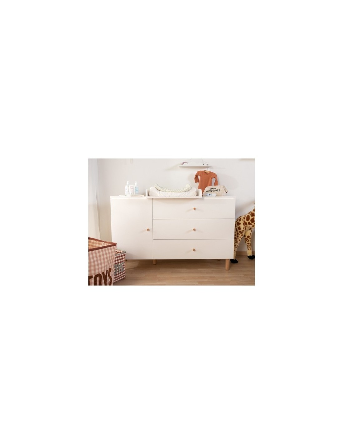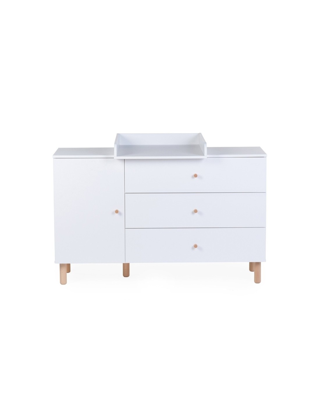 La cómoda Wonder White consta de 3 cajones y un armario con dos estantes. El cambiador incluido es ideal para cambiar a tu bebé cómodamente.
