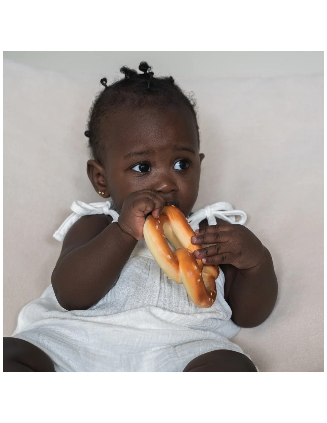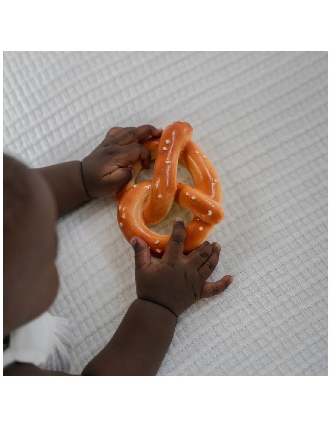 Pepe le Pretzel es un mordedor con forma de pretzel que alivia las molestias de la dentición gracias a su textura suave y realista. Su diseño curvado con huecos facilita el agarre con ambas manos, permitiendo que el bebé lo explore cómodamente. Inspirado en el simbolismo del pretzel, abrazos y unión, transmite calma y ternura mientras fomenta el juego y el descubrimiento. Además, estimula el desarrollo sensorial y la coordinación mano-boca. Es un accesorio versátil que puede utilizarse como mordedor, juguete sensorial, de baño o elemento decorativo.