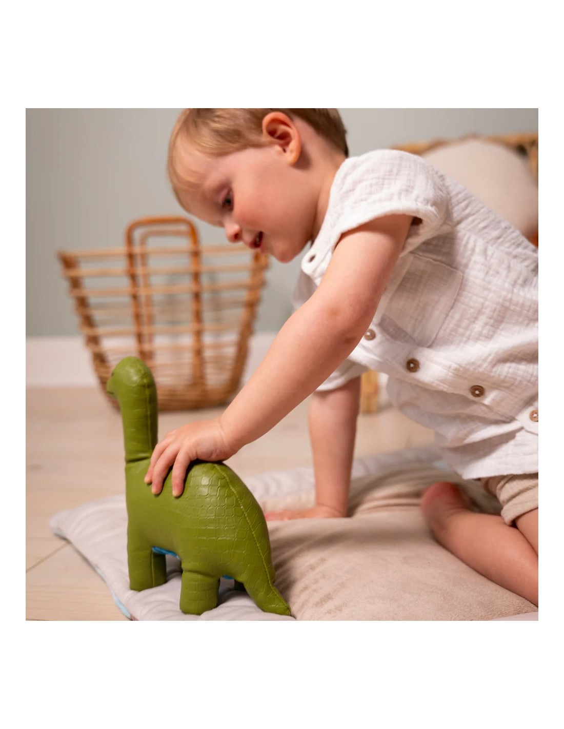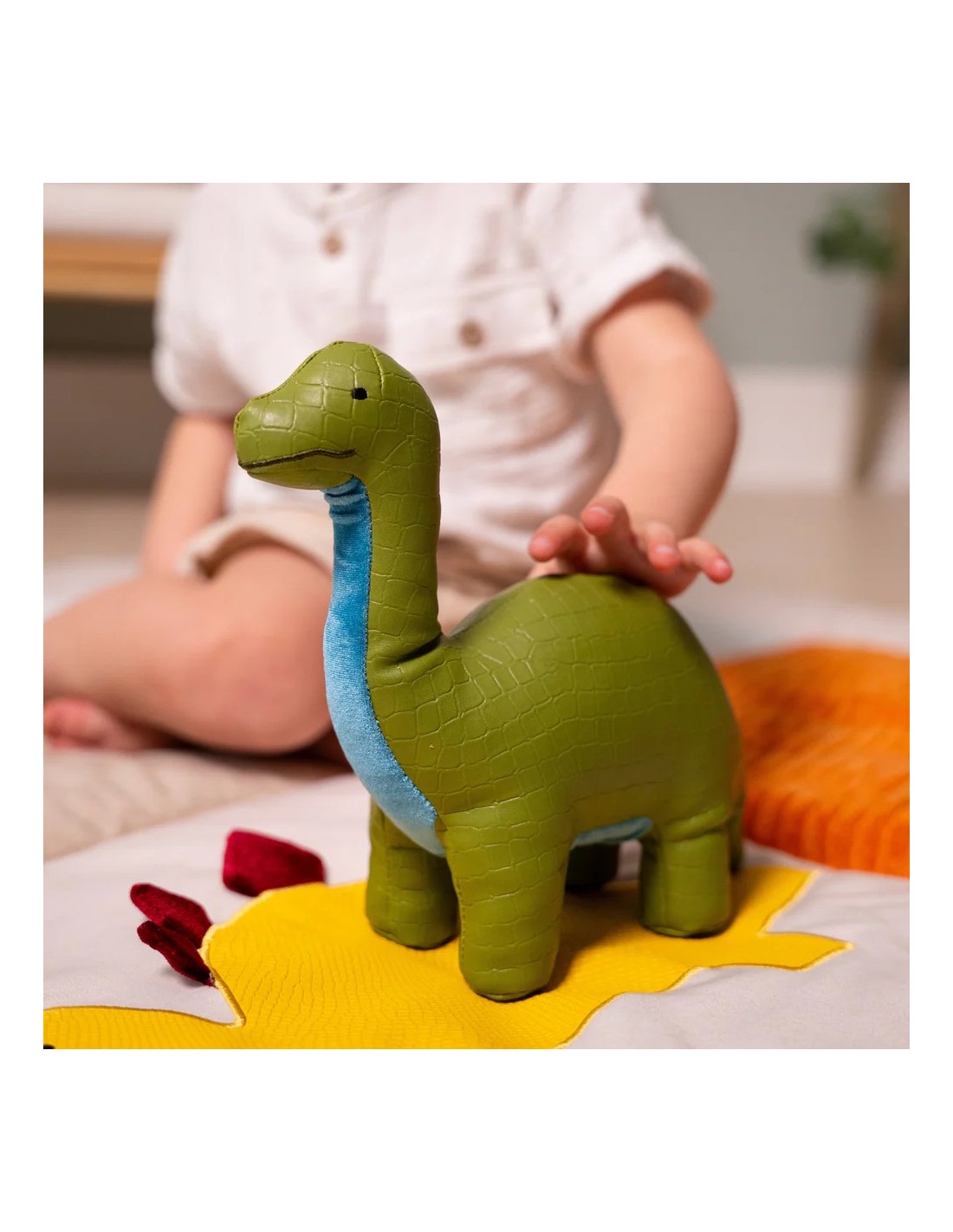 Héctor el Braquiosaurio es un majestuoso dinosaurio de vivos colores que alegrará el día a cualquier niño. Fabricado en piel vegana, Héctor esconde un cascabel que tintinea suavemente con cada movimiento. El material texturizado de su cuerpo verde y el crujiente tejido azul de su vientre y cuello despertarán la curiosidad de los pequeños exploradores. Héctor y sus amigos son perfectos para decorar el dormitorio de los niños y les acompañarán durante mucho tiempo. Los Amigos Dinos son compañeros de juegos, descubrimientos y aventuras, cada uno con su propia personalidad. Prepárate para sumergirte en el mundo de los dinosaurios con Héctor y sus amigos de tierras volcánicas. ¡Adóptalos y colecciónalos para vivir momentos inolvidables!