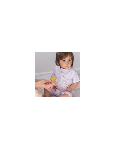 Confeccionado con un delicado tejido de bambú y con un alegre estampado de melocotones, este pelele es perfecto para combinar. Además, la cremallera bidireccional te permite vestirlo fácilmente y te ofrece la máxima versatilidad.
