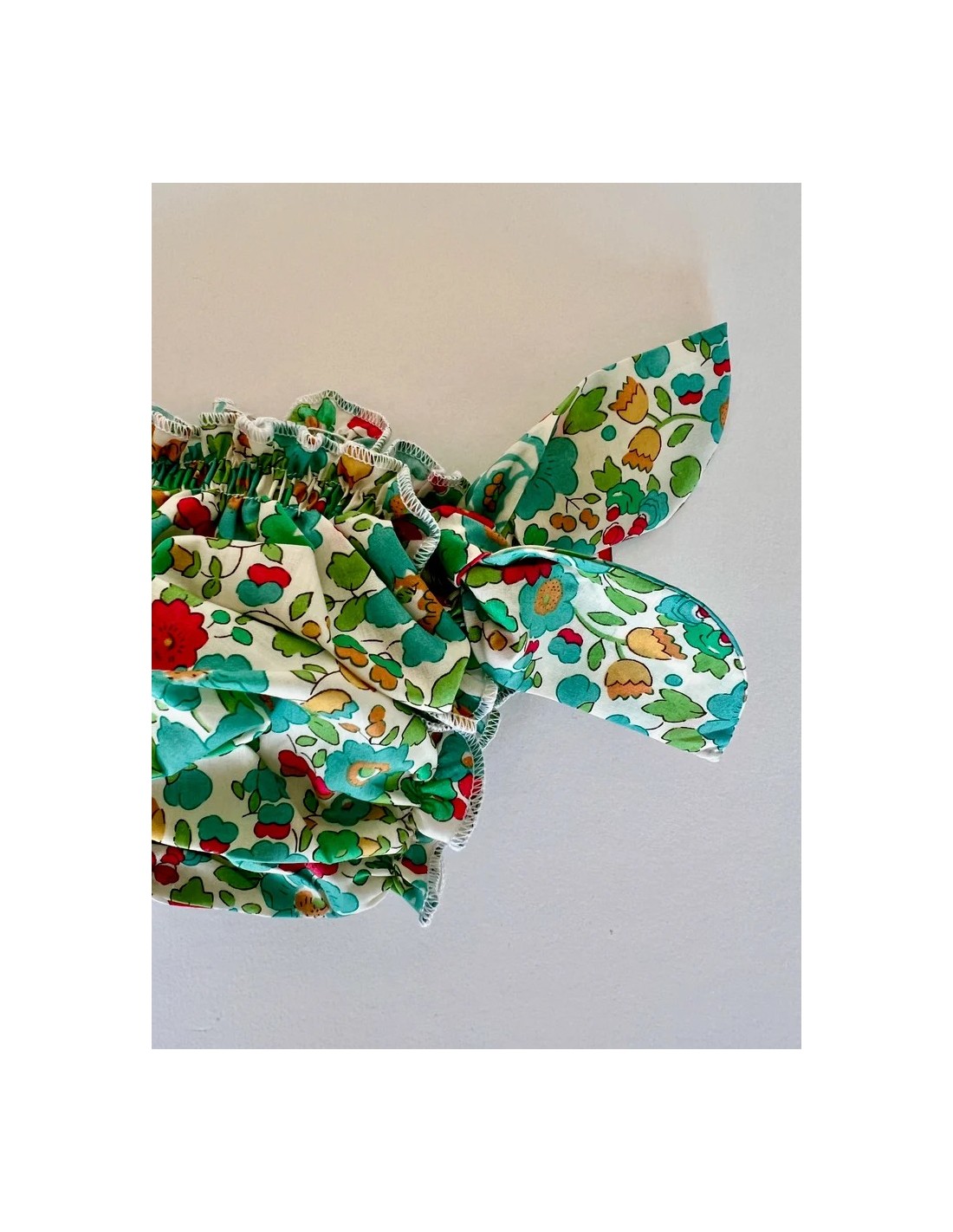 Este bañador está confeccionado en una fina batista de algodón Liberty, que ofrece una suavidad y delicadeza inigualables. Presenta fruncido en la cintura y los muslos, lo que garantiza una comodidad perfecta sin oprimir al niño.
