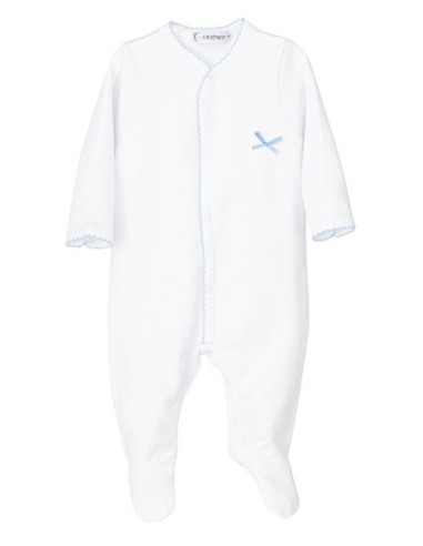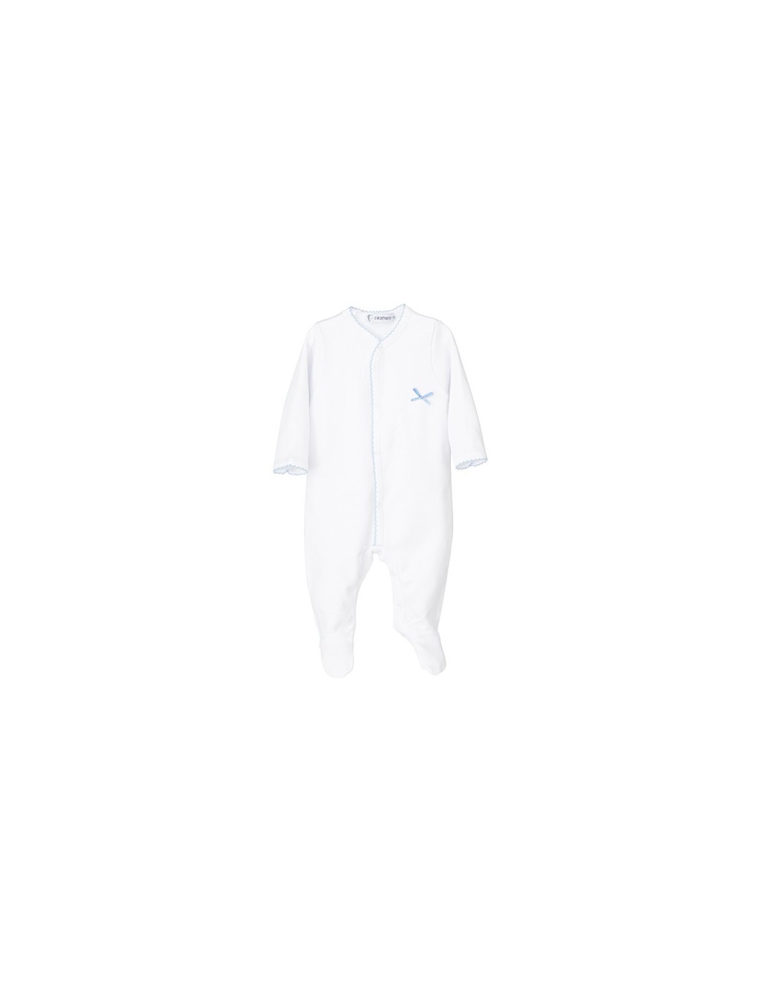 Pelele abierto con botones por toda la parte delantera, manga larga y piececitos. Blanco nieve con puntillita en color azul celeste. Detalle de lacito en la pechera.