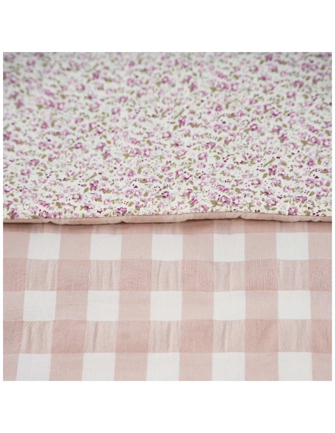 Saco universal para silla de paseo. Acolchado con una guata efecto pluma, el saco es totalmente extraíble mediante 2 cremalleras, para que pueda usarse como colchoneta los meses más cálidos. Parte trasera en Maya 3D, un tejido acolchado y transpirable. Agarre mediante gomas, vueltas y lazos. Confeccionado en estampado Nikole y Vichy Rosa.