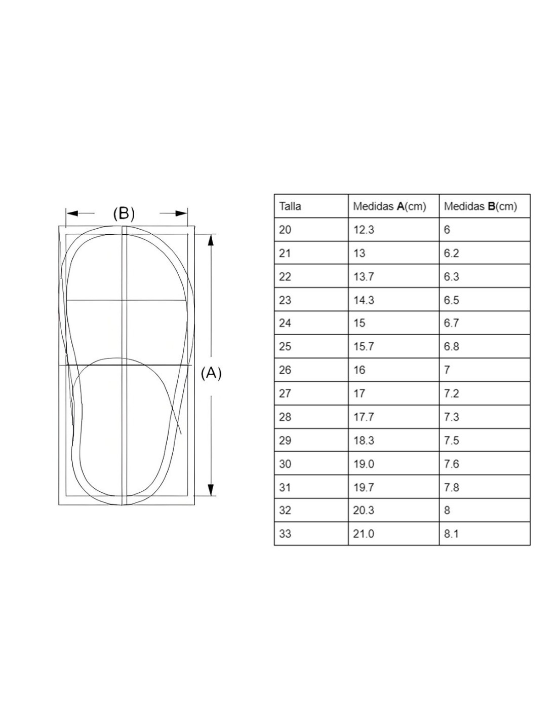 ATENCIÓN: Las medidas de la tabla corresponden a este modelo en concreto y de la suela interior del zapato. Puedes compararla con la medida del pie de tu peque