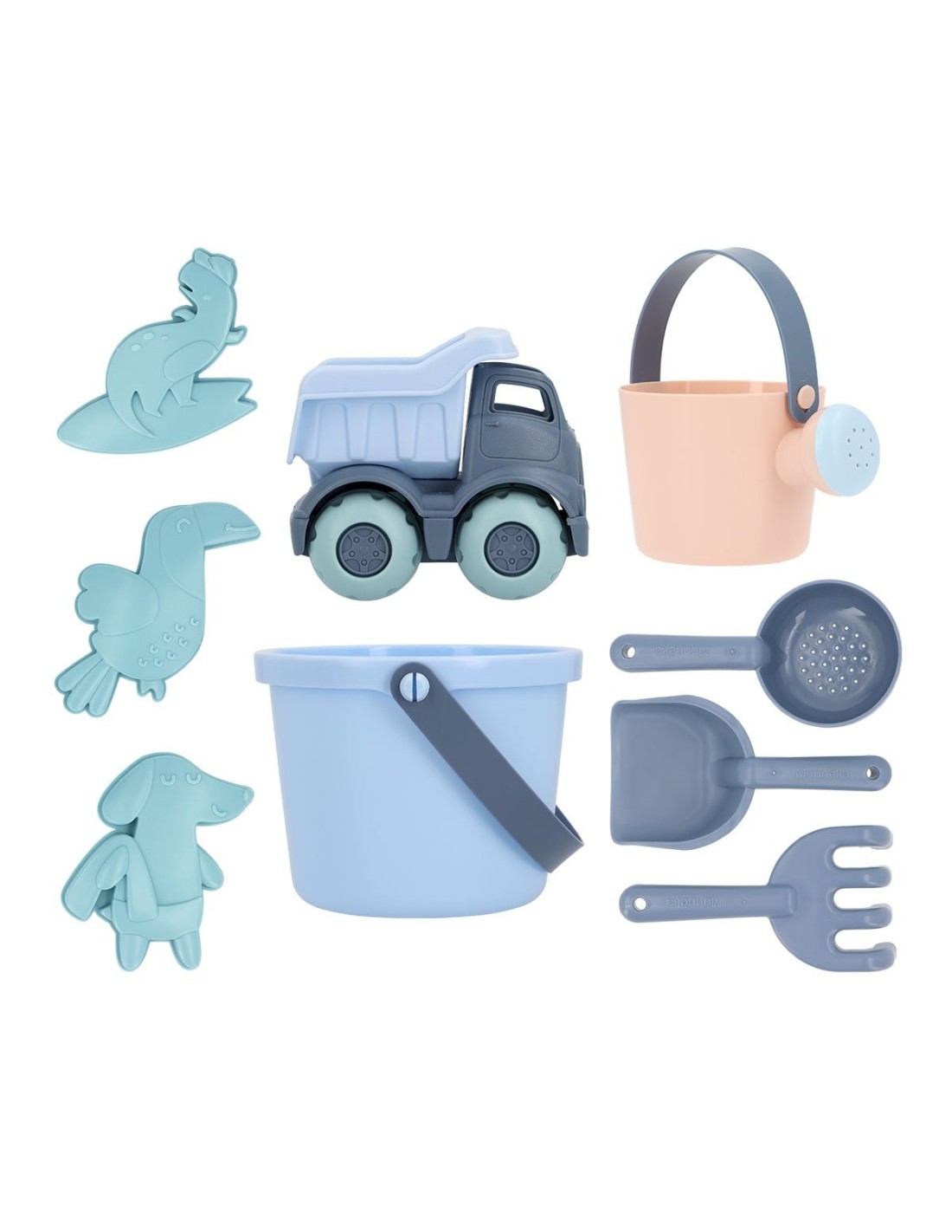 El set de juguetes de playa Monnëka contiene todo lo necesario para jugar en la arena y hacer fantásticas construcciones.