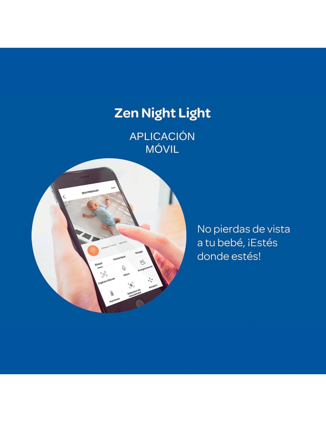 - Aplicación dedicada: Utilice la aplicación dedicada en su smartphone para vigilar a su bebé en movimiento, con la posibilidad de conectar varias cámaras para una vigilancia completa. Aplicación compatible con Zen Connect, Zen Night Light y Zen Nomad.